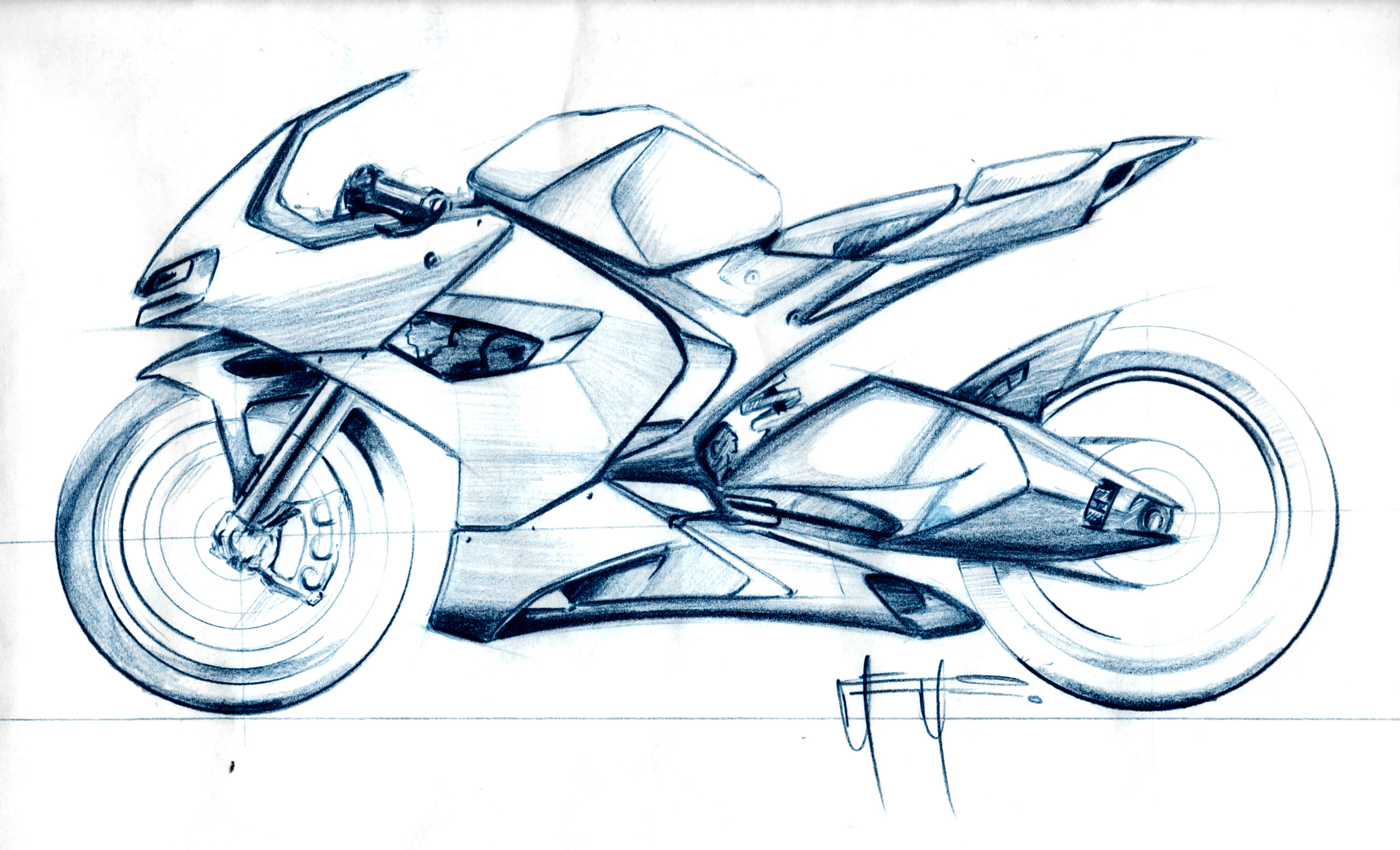 - The low windscreen line and aggressive rake angle establish aerodynamic intent — visually aligning the machine along a diagonal of speed.