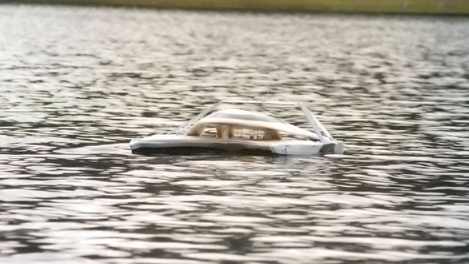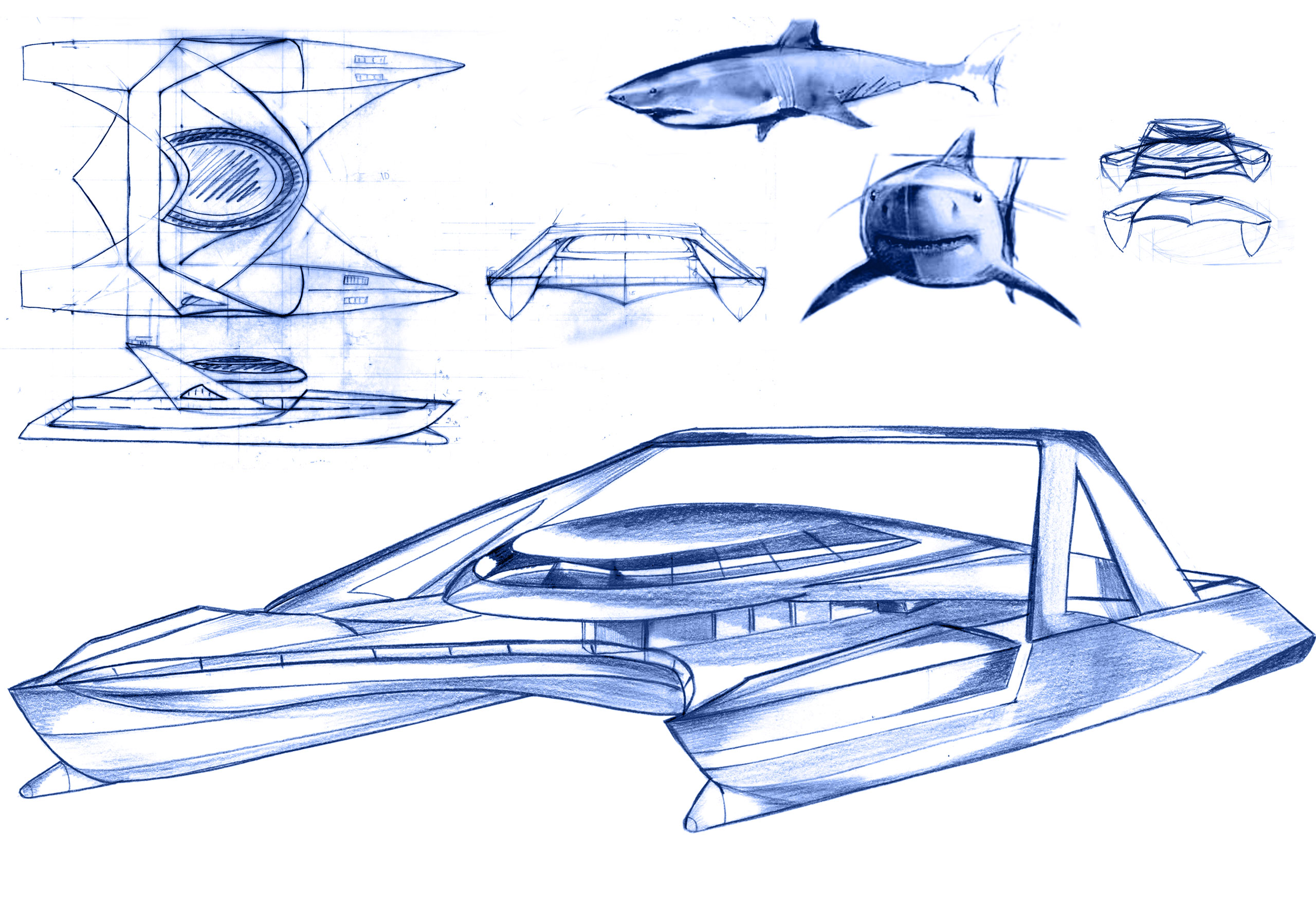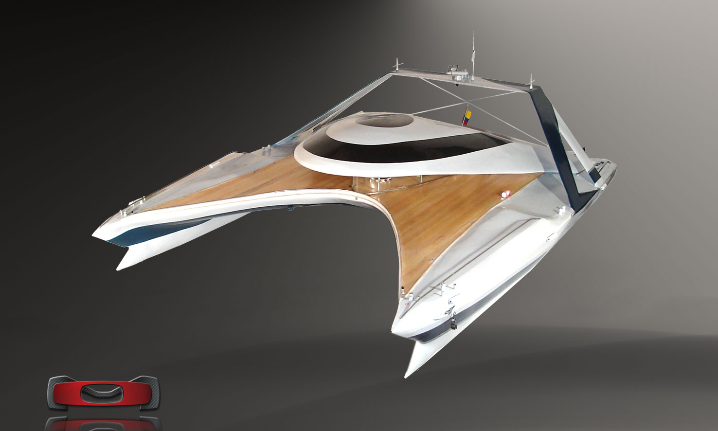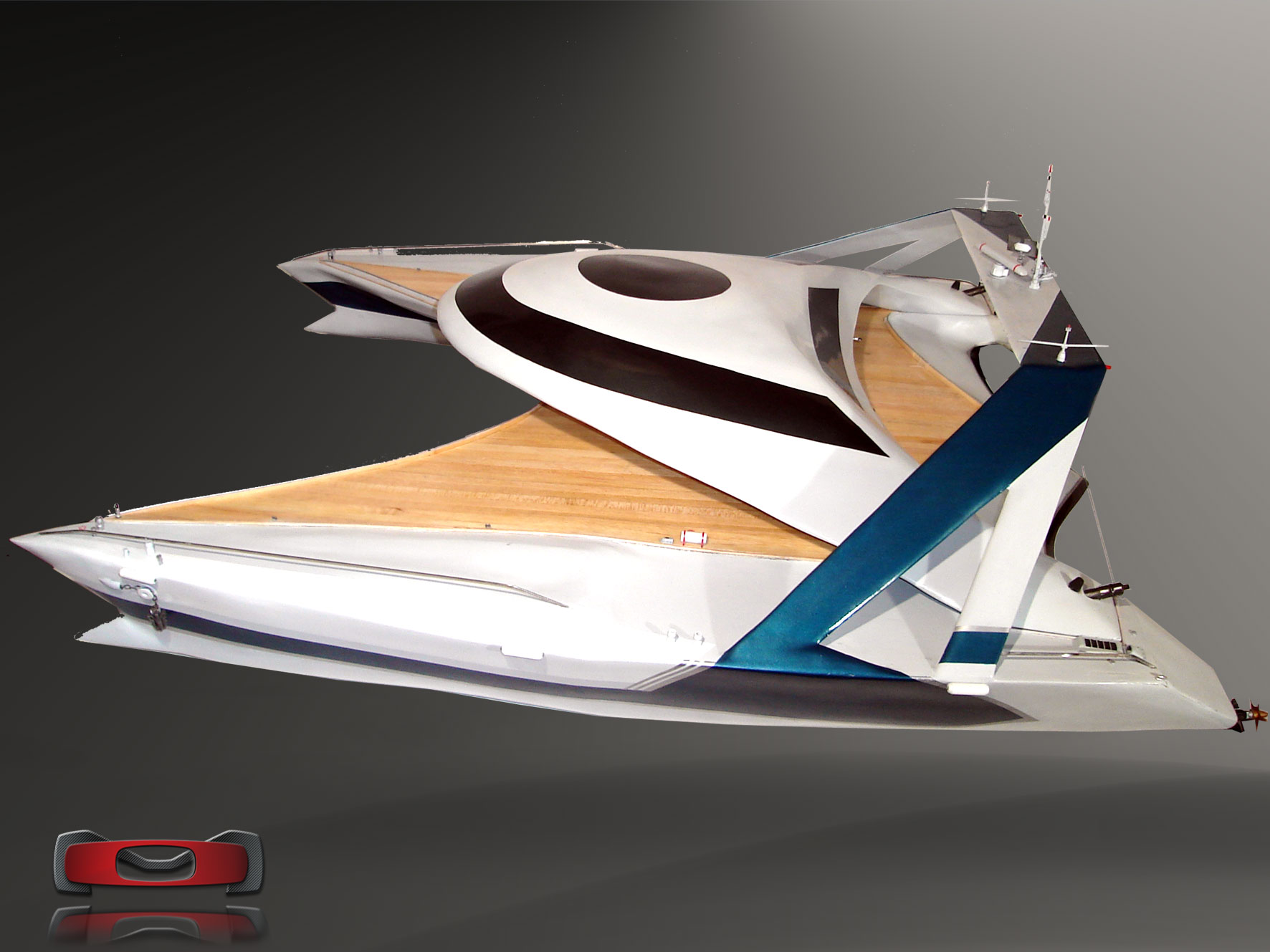 Ultra-low, stretched tri-hull stance with a broad beam and a low center canopy. The massing emphasizes aerodynamic and hydrodynamic balance — a horizontal composition that projects speed and lightness even at rest.