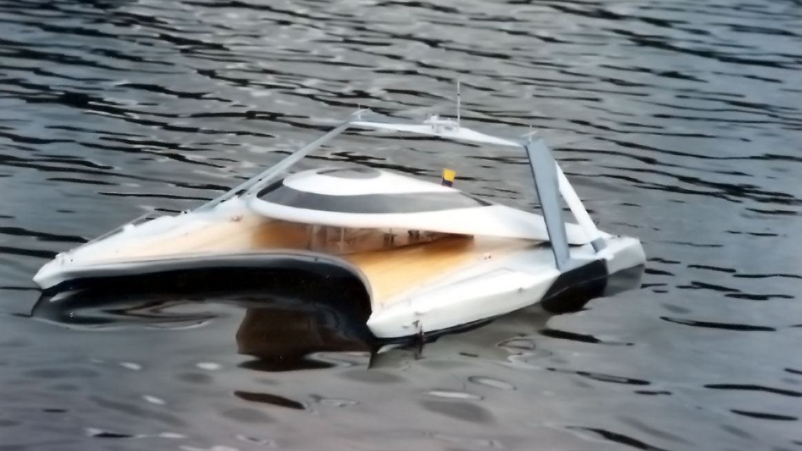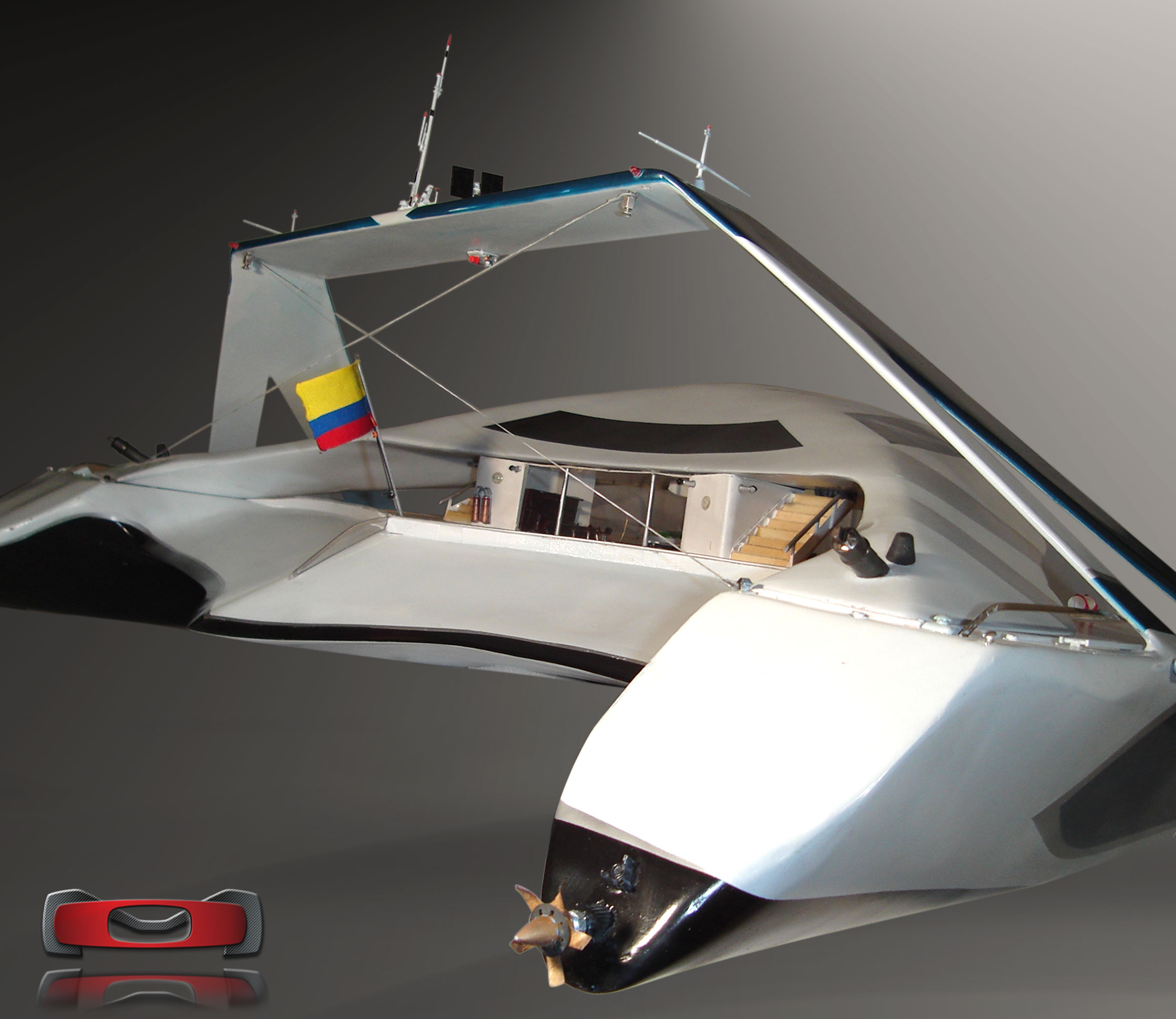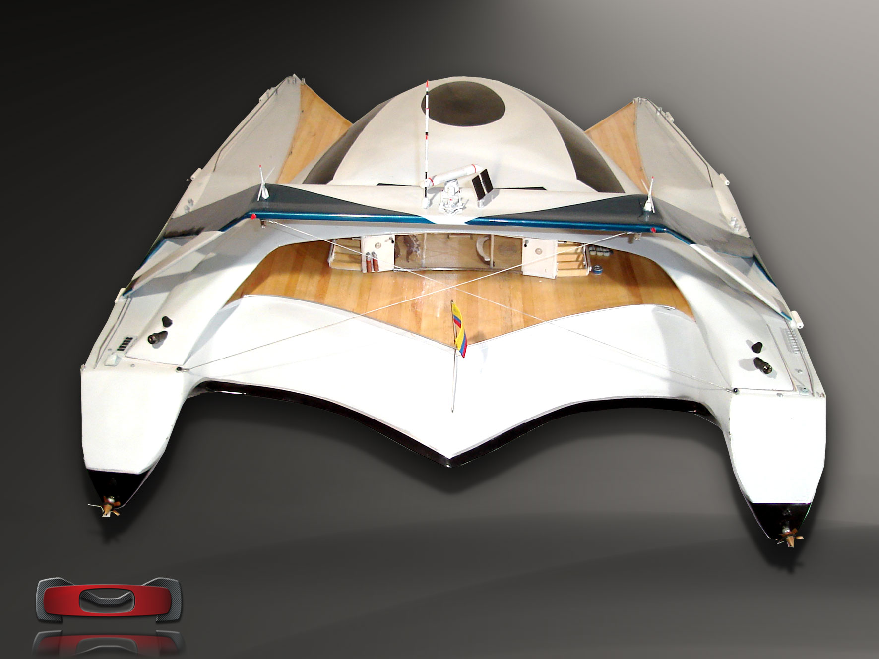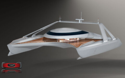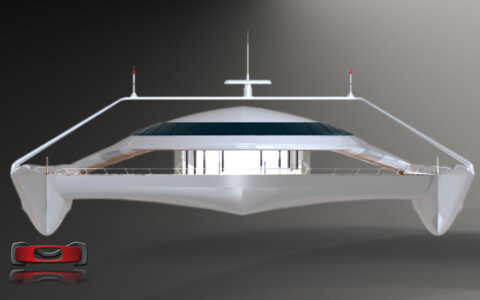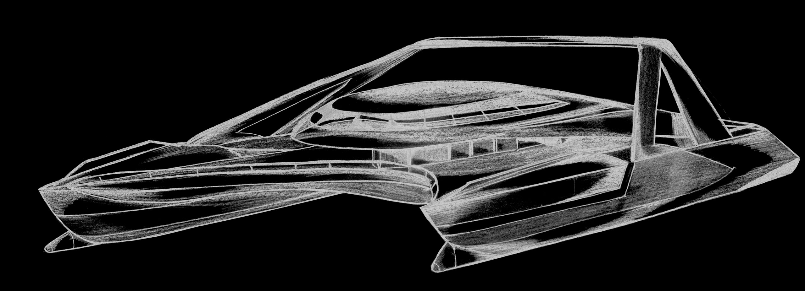 Visually hovering — the raised deck and recessed central void convey lift and hydrodynamic agility. The catamaran’s wide, splayed hulls express stability and minimal drag, while the high structural arch gives a sense of dynamic tension.