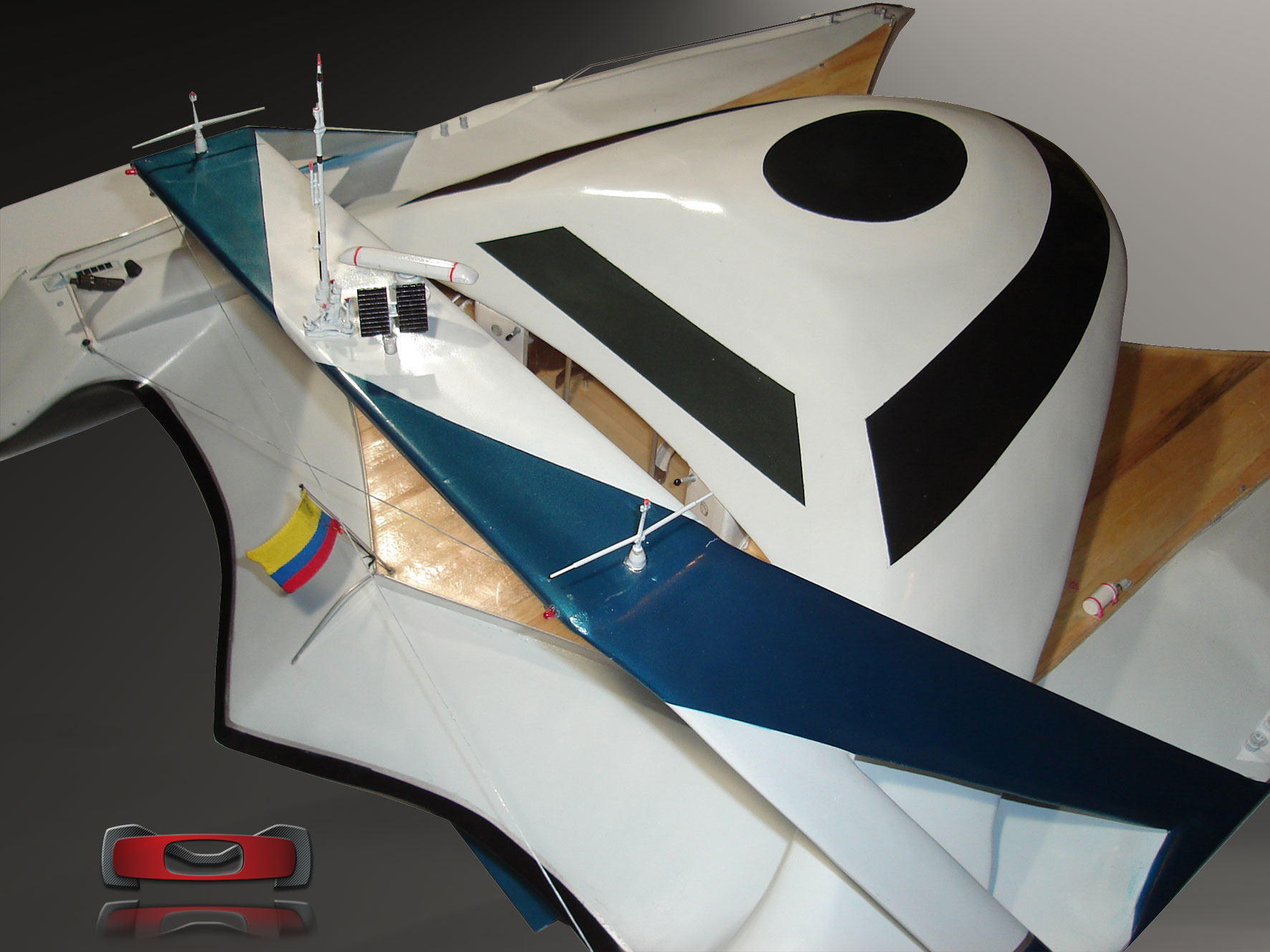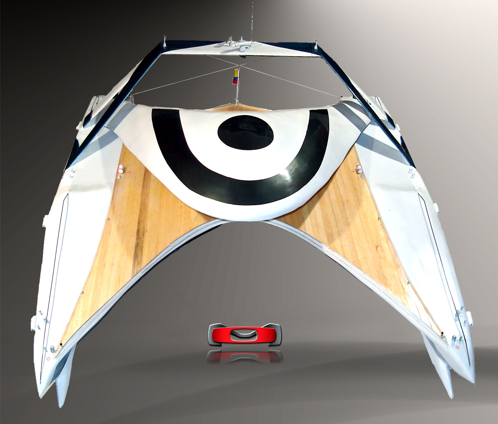 Taut, fluid transitions between planar hulls and the warm wooden deck create contrast between engineered precision and natural tactility. The continuous deck plane flows uninterrupted into the canopy, generating a sculptural unity of form.